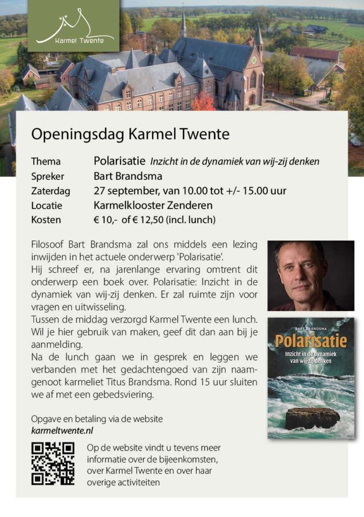 De opening van seizoen 2025-2026 wordt afgetrapt met een startdag. Bart Brandsma houdt een lezing waarbij hij voorgaat in het gesprek dat daarna volgt. Zijn onderwerp is polarisatie: de kracht van het stille midden en inzicht in de dynamiek van het wij-zij denken. Tevens leggen we een link met polarisatie in deze tijd en wat pater Titus Brandsma daar in de jaren dertig van de vorige eeuw al op wees.