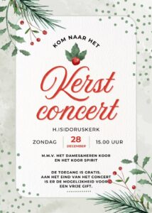 Zondagmiddag 28 december vindt in de H. Isidoruskerk te St. Isidorushoeve het kerstconcert plaats. De koren Spirit en het dames- en herenkoor van St. Isidorushoeve zullen in samenwerking met een combo dit kerstconcert gaan verzorgen. Op het kerkplein zult u voor aanvang van het kerstconcert worden verwelkomt met de klanken van midwinterhoornblazers. De aanvang van het concert is 15.00 uur. De toegang is gratis. Na afloop is er de gelegenheid om een vrije gift te doen. Er is tevens voor iedereen na afloop een kop warme chocolademelk, die wordt verzorgd door een aantal hulpboeren van Zorgboerderij Erve Meyerinkbroek. Iedereen is […]